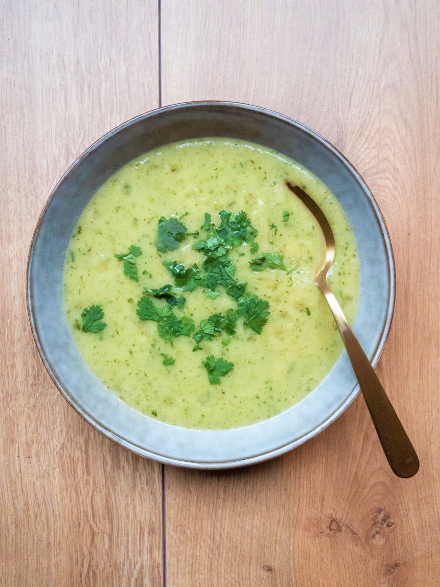 - Voeg de waterkers, koriander en citroensap toe en pureer de soep met een staafmixer of blender.